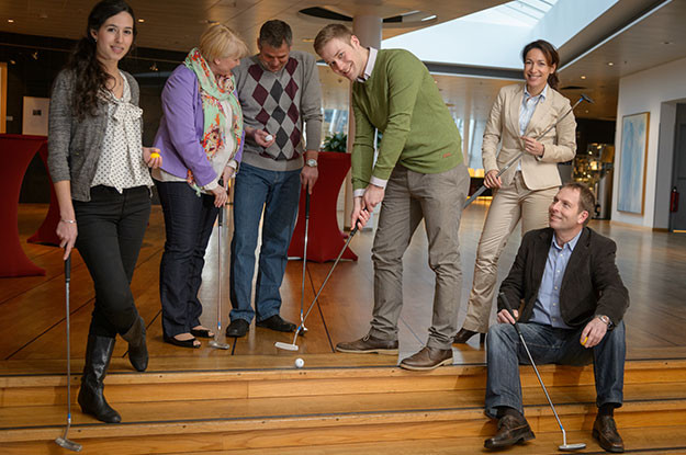 Team spirit, skill and a good feel for the ball are required. During our Christmas golf tournament, we integrate our mobile golf course into the various areas of the hotel. The result is an individual and entertaining Christmas golf course directly inside your hotel. Your colleagues play their way through conference rooms, offices, hotel rooms, suites, bars, restaurants, garages or even through kitchen, lobby, fitness or laundry room.