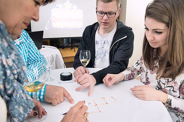 Welches ist die Quersumme unseres Gründungsjahres? Wie hieß der Hund des ersten Vorstandsvorsitzenden? Und warum tragen alle Schiffe unserer Reederei Namen mit "P"? Oder wie wäre es mit einem Song-Quiz, zahlreichen Mini-Quizgames oder vielfältigen Teamspielen? Schätzfragen, optische Täuschungen, Scherzfragen - all das sorgt dafür, dass jede Person sein "Fachgebiet" und die eigene Kompetenz einbringen kann, um die für das Team so wichtigen Punkte zu sammeln.